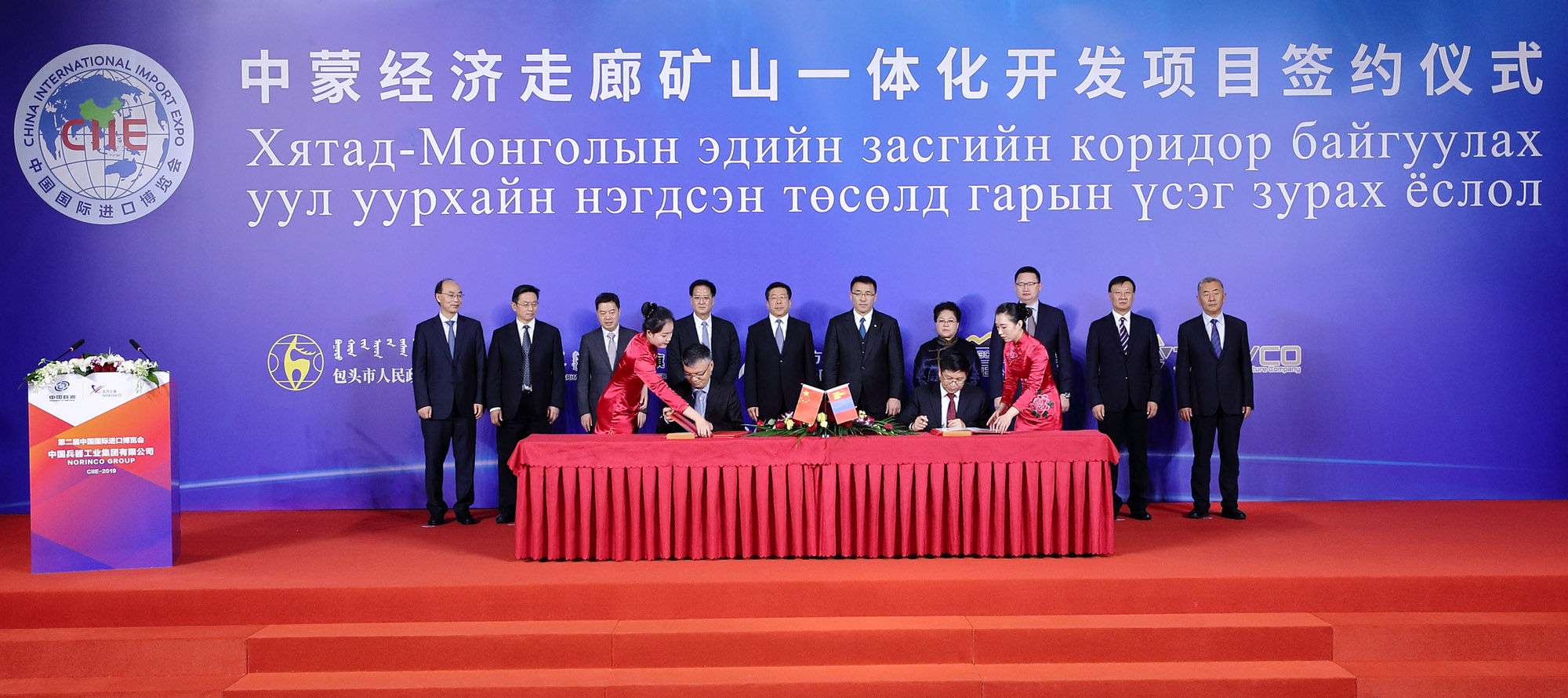 11月4日,第二屆中國國際進口博覽會開幕前,在中國兵器工業集團有限公司董事長焦開河和蒙古礦業與重工業部部長蘇米亞巴扎爾·道古蘇仁、國務院國資委副主任任洪斌、內蒙古自治區副主席艾麗華的共同見證下,中蒙經濟走廊礦山一體化項目在上海簽約。簽約前,各相關方進行了友好會談。