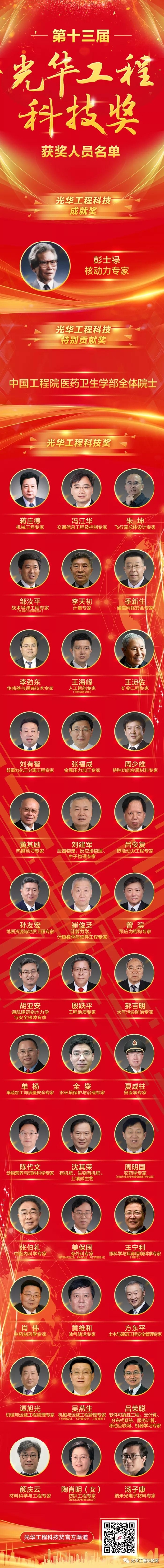 此次揭曉儀式正式公布了從296名候選人中評選出的第十三屆光華工程科技成就獎、光華工程科技特別貢獻獎以及光華工程科技獎的獲得者,最終僅有40位專家和1個團體獲獎。本屆光華工程科技獎的獲獎科學家們,緊密圍繞國家重大戰略需求,瞄準經濟建設和事關國家安全的重大工程科技問題,緊貼新時代社會民生現實需求和軍民融合需求,加快自主創新成果轉化應用,為創新驅動發展,建設科技強國,以及實現“兩個一百年”奮斗目標和中國夢做出了重要貢獻。