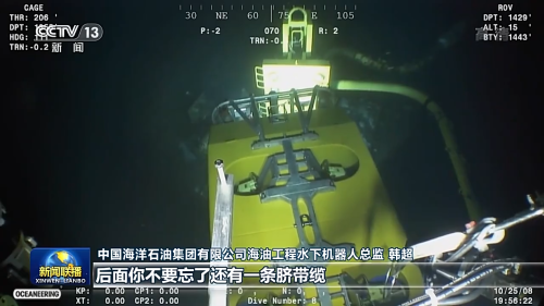 中國海洋石油集團有限公司海油工程水下機器人總監 韓超:你的手腳要并用,然后你要在抓的同時,后面你不要忘了還有一條臍帶纜是連著你的。你再稍微一用力,那通訊要不然斷了,要不然就絕緣報警。