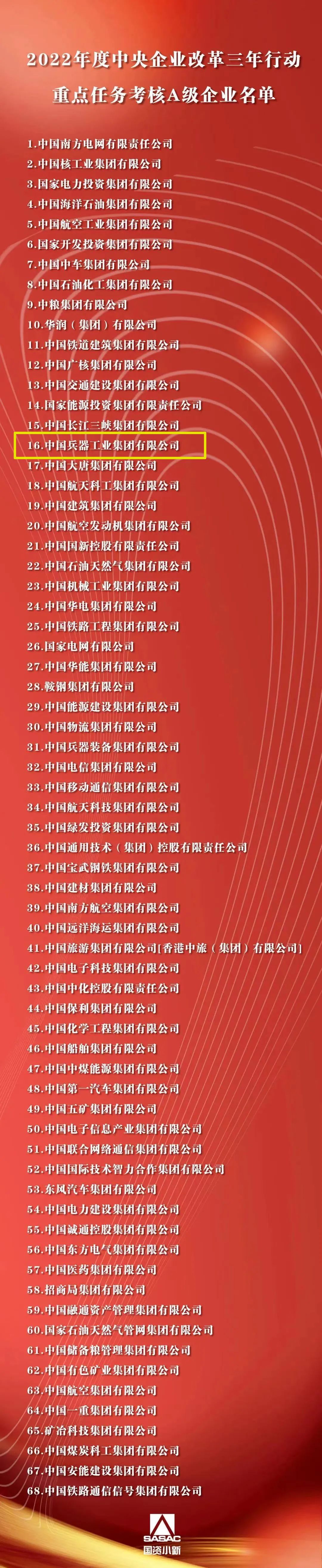 根據《中央企業改革三年行動重點任務考核實施方案(試行)》和《中央企業改革三年行動重點任務考核指標表(2022版)》,經審定,國務院國資委發布2022年度中央企業改革三年行動重點任務考核A級企業名單,中國兵器工業集團有限公司獲評A級